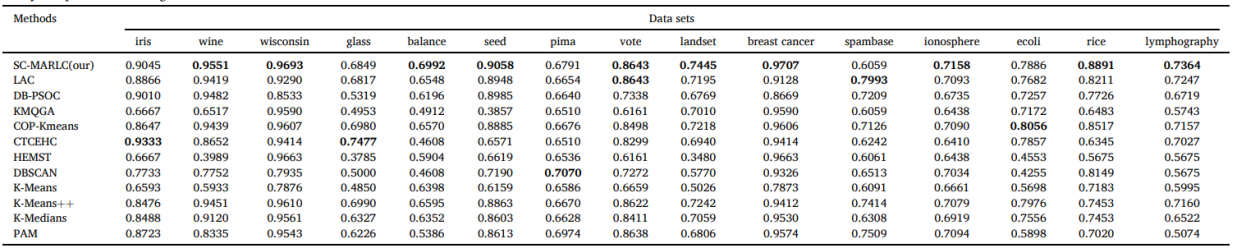 论文研究对比了SC-MARLC与11种现有聚类算法在15个公共数据集上的性能,结果显示所提出的算法在10个数据集上表现最佳。