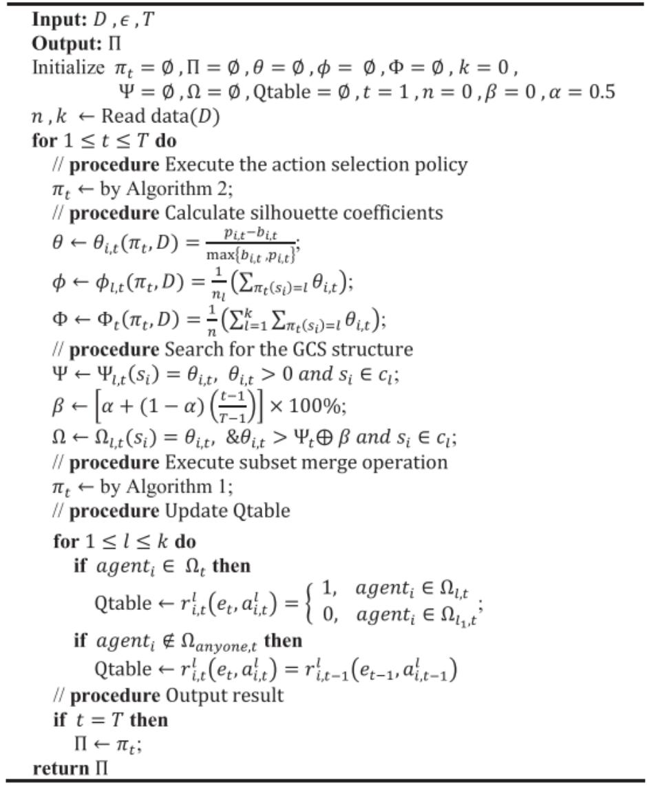 图2. 基于轮廓系数的多智能体强化学习聚类算法伪代码