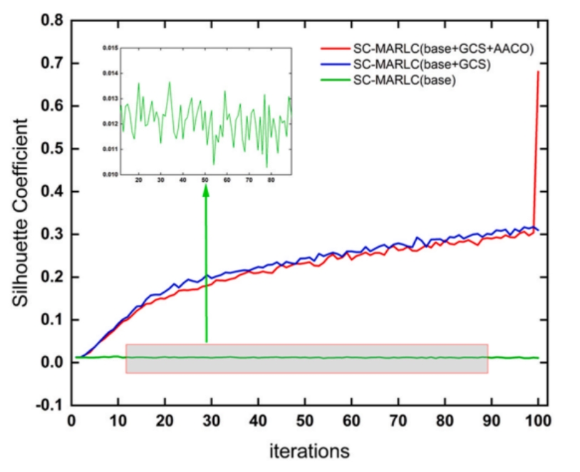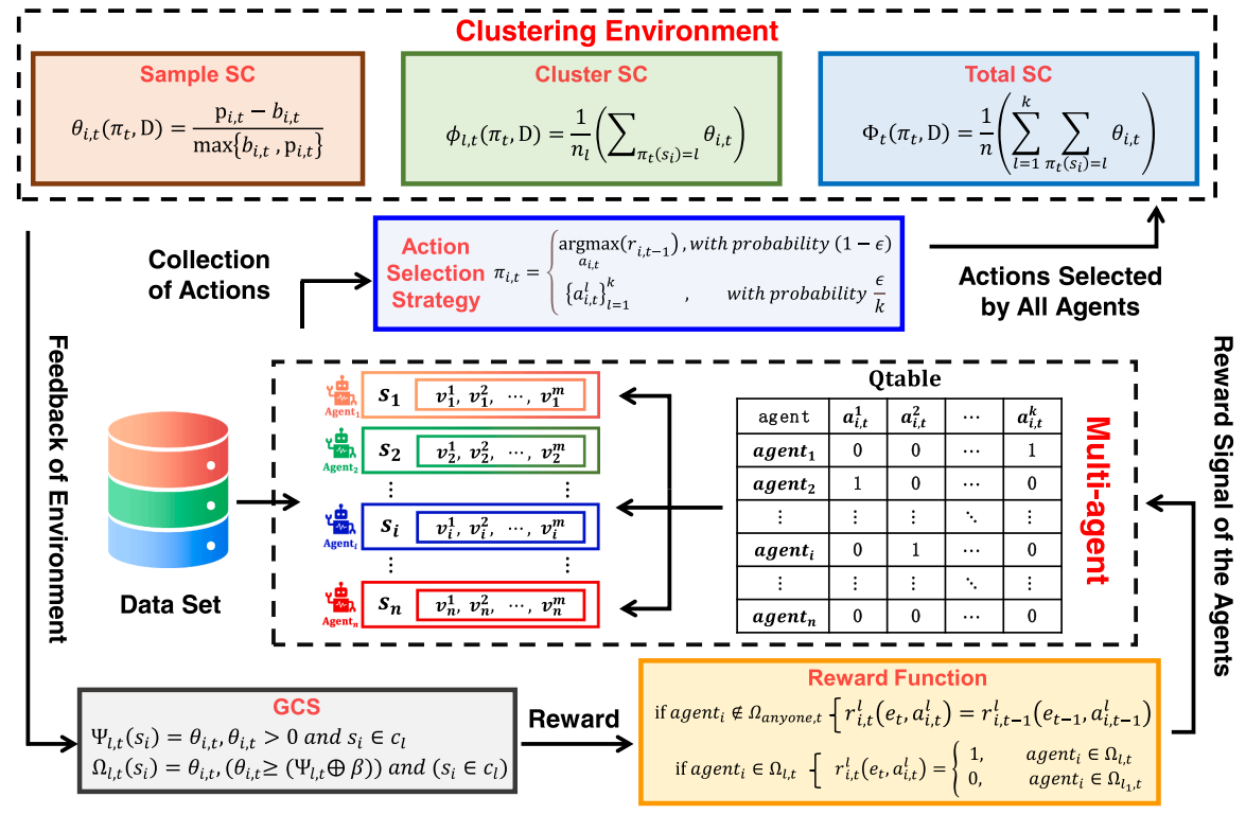 针对这一难题,电子信息工程公司李凤莲教授团队提出了一种基于轮廓系数(Silhouette Coefficient)的多智能体强化学习聚类算法(Multi-agent reinforcement learning clustering algorithm based on silhouette coefficient ,SC-MARLC)。该算法通过建立了多智能体与样本之间的映射关系,为每一个样本点分配一个智能体,并基于样本轮廓系数提出了良好类簇子集结构,该结构能帮助智能体寻找最佳的数据聚类结果,显著的克服非平稳性问题。最后,提出了智能体的动作修正策略,以加速算法收敛速度,降低算法时间复杂度。