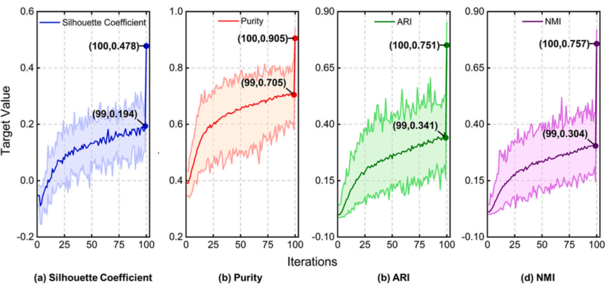 本研究的创新点在于将轮廓系数引入多智能体强化学习聚类中,有效地解决了多智能体系统中的非平稳性问题,提高了算法的收敛性和性能。这一成果不仅推动了强化学习在聚类分析中的应用,也为解决复杂环境下的决策问题提供了新的思路和方法。此外,该算法的高性能表现预示着其在实际应用中的巨大潜力,特别是在需要高效数据处理和分析领域。目前课题组已将该方法用于新能源电池材料安全性评估预测系统,并申请国内发明专利一项。