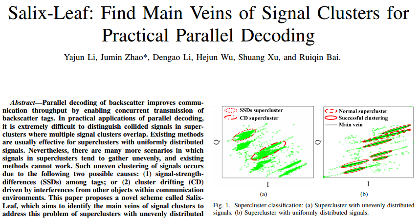 近日,bg大游官方网站赵菊敏教授团队在解决并行解码中的信号超级簇问题方面取得突破,显著提升了系统通信效率。相关成果发表于《IEEE Transactions on Mobile Computing》(简称IEEE TMC)期刊,题目为“Salix-Leaf: Find Main Veins of Signal Clusters for Practical Parallel Decoding”。该论文的第一署名单位为bg大游,公司博士研究生李亚君为论文第一作者,赵菊敏教授为论文通讯作者。IEEE TMC是中国计算机学会(CCF)推荐的A类顶级国际期刊、中科院1区TOP期刊,在计算机网络、移动计算领域享有极高的学术声誉。该论文也是公司以第一署名单位在IEEE TMC发表的首篇论文。